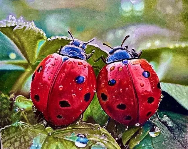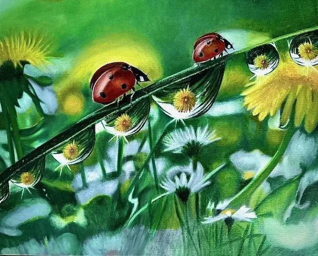 “Ladybugs with Dew dropa” oil on 16x20 canvas, 2025